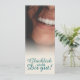 Glücklich, Dir, instinto! Kompliment Karte mit lachendem Frauengesicht und handschriftlichen Grüßen auf der Vorderseite der Karte. Restliche Flächen stehen zur freien Verfügung.