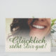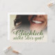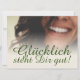 Glücklich, Dir, instinto! Kompliment Karte mit lachendem Frauengesicht und handschriftlichen Grüßen auf der Vorderseite der Karte. Restliche Flächen stehen zur freien Verfügung.
