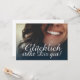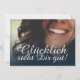 Glücklich, Dir, instinto! Kompliment Karte mit lachendem Frauengesicht und handschriftlichen Grüßen auf der Vorderseite der Karte. Restliche Flächen stehen zur freien Verfügung.