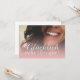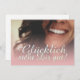 Glücklich, Dir, instinto! Kompliment Karte mit lachendem Frauengesicht und handschriftlichen Grüßen auf der Vorderseite der Karte. Restliche Flächen stehen zur freien Verfügung.