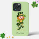Gnomo verde de sorte bonito segurando um trevo sobre fundo do verde limão leve. O texto pode ser personalizado.