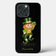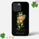 Gnomo verde de sorte bonito segurando um trevo sobre fundo preto. O texto pode ser personalizado.