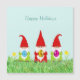 Cartão de Férias com Gnomos Fofos Segurando Ovos de Páscoa. O texto pode ser personalizado.