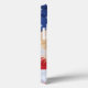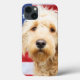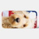 Goldendoodle se senta orgulhosamente em frente à bandeira americana no Dia Memorial.