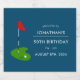 Uma simples ilustração de uma bandeira vermelha de golfe, bola verde e golfe em um fundo azul escuro que aparece na etiqueta de 50ª garrafa de licor de Festa de aniversário. Personalize o rótulo com o nome do seu amigo, marido, colega de trabalho, parceiro etc. e data de festa de aniversário.