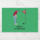 Golfista verde-claro, vestindo um boné, camisa vermelha e calças azuis, colocando uma bola de golfe em uma etiqueta de design. Personalize o texto.