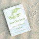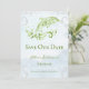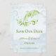 Personalize um anúncio de casamento único com um golfinho verde. Salve a data. O design de lançamento apresenta um golfinho metálico estilizado contra um fundo de ondas do oceano silenciadas adornado com rolhas elegantes e texto que você pode personalizar com seus detalhes de data de casamento. Salve ainda o anúncio de data disponível para este design em várias cores.