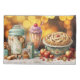 Uma coleção de guloseimas, incluindo biscoitos, um batido de leite e uma torta, é arranjada de forma artística numa toalha de mesa decorada, rodeada de maçãs e folhas de outono. As luzes brilhantes e quentes do fundo criam uma atmosfera confortável e festiva. Digital Art Photoshop CS5