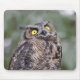 A mousepad featuring a wide-eyed great horned owl. This young owl was turning its head to watch a song bird. It resulted it a rather humorous wide-eyed expression.