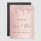 Uma cinta e uma moda Salve a placa Date para uma festa de aniversário 90. Um fundo cor-de-rosa feminino, rosa, dourado, decorado com gotas de ouro rosa. Modelos para uma data e nome/idade 90. Letras rosa escuras de cor dourada. O texto: Salvar a Data é gravado com um script de estilo com letra de tendência grande.