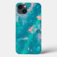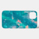 A obra de arte abstrata original de ZoeSPEAK nesta capa de iPhone 13 foi feita a partir da fotografia original de Zoe de gotas de chuva em uma folha no jardim. As cores do design são azuis aqua tropicais e rosados pêssego.
