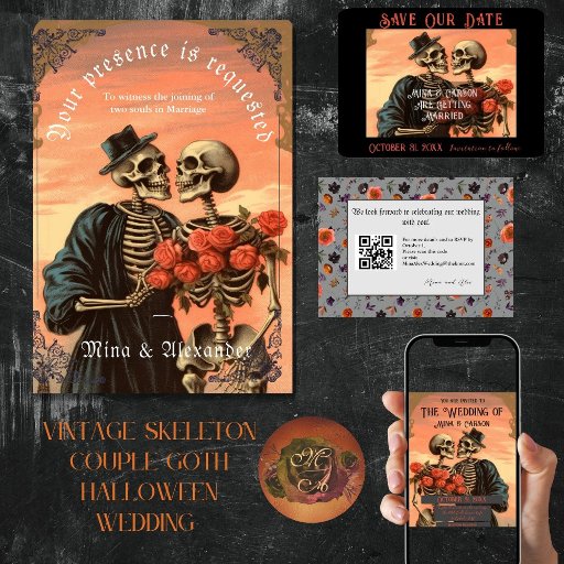 Adicione um pouco de curiosidade aos seus convites para o casamento de Halloween do gótico com o nosso convite de casamento de esqueleto vintage, amigável com o orçamento do casal, com o código QR. Apresentando uma noiva de esqueleto vintage e uma ilustração de noivo que traz uma reviravolta divertida para o seu dia especial. Todas as informações pertinentes estão na frente, enquanto o inverso oferece uma modelo para o seu texto personalizado e um QR para o seu site de casamento. É uma mistura saborosa e divertida que certamente intriga seus convidados sortudos.
