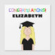 Ilustração do formando feminino com texto colorido lendo "Parabéns!"