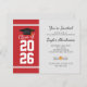 Adicione seu ano de graduação, nome e detalhes do local com data para este moderno fundo vermelho e branco negrito com convite de festa de formatura de tipografia negra usando nosso botão "Personalizar" acima.