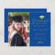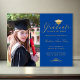 Este elegante cartão de anúncio personalizado de graduação de fotos do orçamento apresenta sua foto à esquerda e à direita um falso boné de ouro com a palavra "Formando", classe/ano, nome e outros detalhes da cerimônia na caligrafia formal faux gold script para personalizar um fundo azul real. Desenhada por Susan Coffey.