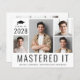 Anúncio de graduação de mestrados de baixo custo apresentando uma colagem de 4 fotos, "Mastered It" escrito na parte inferior em letras maiúsculas e seu ano de aula, nome e faculdade ou universidade em tipografia simples. No verso, adicione uma foto adicional e uma mensagem personalizada.