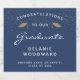 Celebre o marco do seu formando em estilo com estas etiquetas de garrafa de vinho espumante de graduação personalizada, com as palavras "Parabéns ao nosso Formando" em texto branco sobre fundo azul escuro. A palavra "Formando" aparece em um script gracioso no estilo de escrita manual. Um par de bonés de conselho de argamassas de brilho dourado e uma dispersão de ouro confete decoram a parte superior da etiqueta. Personalize-o com seu formando, escola e ano de graduação.