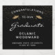 Celebre o marco do seu formando em estilo com estas etiquetas de garrafa de vinho espumante de graduação personalizada, com as palavras "Parabéns ao nosso Formando" em texto branco sobre fundo preto. A palavra "Formando" aparece em um script gracioso no estilo de escrita manual. Um par de bonés de conselho de argamassas de brilho dourado e uma dispersão de ouro confete decoram a parte superior da etiqueta. Personalize-o com seu formando, escola e ano de graduação.