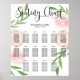 Gráfico de assentos de casamentos com flores cor-de-rosa e texto preto - você pode adicionar o nome da noiva e do noivo, a data do casamento e os nomes dos convidados (16 mesas). As dimensões do poster são de 16 por 20 polegadas.