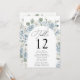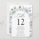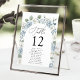 Gráfico de assentos florais elegante com um quadro floral arquivado de rosas azuis e brancas poeirentas, hidrangeas e folhas de eucalipto e verde peludas. A "Mesa" é exibida em um script de caligrafia preta com o número da tabela e os nomes de convidados mostrados abaixo em um fundo branco. O design repete atrás. Para solicitar o gráfico de número de tabela, edite cada cartão com o número da tabela e os nomes de convidado e adicione-o ao carrinho. Projetado para coordenar com a nossa coleção de casamento Elegante Dusty Floral.