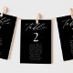 Gráfico elegante de assentos de casamento com "mesa" exibido em um roteiro de caligrafia branca com o número da tabela e os nomes de convidados mostrados abaixo em um plano de fundo preto. O design repete atrás. Para solicitar o gráfico de número de tabela, edite cada cartão com o número da tabela e os nomes de convidado e adicione-o ao carrinho. Projetado para coordenar com a nossa coleção de casamento do Modern Elegance.