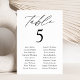 Gráfico de assentos de casamento elegante com "mesa" exibido em um script de caligrafia preta com o número da tabela e duas colunas de nomes de convidados mostrados abaixo. O design repete atrás. Para solicitar o gráfico de número de tabela, edite cada cartão com o número da tabela e os nomes de convidado e adicione-o ao carrinho. Projetado para coordenar com a nossa coleção de casamento do Modern Elegance.