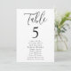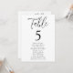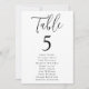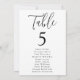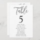 Gráfico moderno de assentos de casamento com "Mesa" exibido em um script preto com o número da tabela e os nomes de convidados mostrados abaixo em um fundo branco. O design repete atrás. Para solicitar o gráfico de número de tabela, edite cada cartão com o número da tabela e os nomes de convidado e adicione-o ao carrinho. Projetado para coordenar com nossa coleção de casamento Simple Script.
