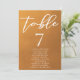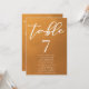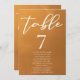 Este cartão de número da mesa de casamento de ouro rústico com números apresenta uma elegante tipografia branca sobreposta num gradiente de tons de terra subestimado. Matizes simples cor de laranja claro e castanho seguem as atuais tendências de queda para um casamento boêmico neste outono. Conclua a aparência com o seu script minimalista sobre o desvanecimento da cor.