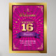 Um doce poster de 16 festas que lembra um concerto ou um poster de circo. Um medalhão encerra as palavras ouros "Doce 16" no topo de um fundo rosa brilhante de explosão. O nome da aniversariante se destaca em uma faixa roxa brilhante. Use como sinal de boas-vindas para seus convidados e adicione uma mensagem especial para todos verem. Disponível com produtos correspondentes. com
