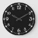 Números brancos clássicos no relógio de parede preta com estilo de máquina de escrever antiga. 12, 3, 6 e 9 são ligeiramente maiores que os restantes. Segundos são marcados na discagem externa com pontos em pontos de 5 minutos.