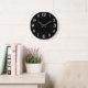 Faça retroceder os números brancos no relógio da parede preta com um estilo de máquina de escrever vintage. 12, 3, 6 e 9 são ligeiramente maiores que os restantes. Segundos são marcados na discagem externa com pontos em pontos de 5 minutos.