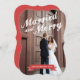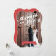 Uma saudação moderna de "Casado e Feliz" é a frente e o centro desta design que incorpora texto cursivo e tipografia química para um olhar adorável que certamente celebrará seu primeiro Natal como Sr. e Sra. Uma saudação contemporânea casual para enviar a família e amigos, este design incorpora uma faixa vermelha festiva para seu nome familiar personalizado.