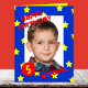 Este grande cartão de aniversário apresenta sua foto como o ponto focal cercado por um quadro azul com estrelas amarelas sobre ele. As palavras "FELIZ ANIVERSÁRIO" aparecem em vermelho no canto superior esquerdo da fotografia e o nome do aniversariante aparece no canto inferior direito com a idade de aniversário que pode ser personalizada num círculo vermelho no canto inferior esquerdo. Este é um grande cartão de aniversário único, que é excelente para crianças que são rapazes. Copyright Kathy Henis
