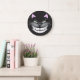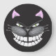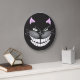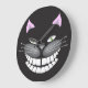 Chester, o Gato Cheshire, num relógio preto. não se atrase para uma data muito importante.