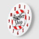 Um relógio de parede único lendo Barber Compra em letras retrorativas em um fundo listrado vermelho e branco cercado por letras vermelhas e pretas em branco.