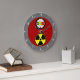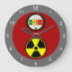 O design neste Relógio de Parede apresenta a imagem de um discagem de dosimetria de radiação com uma escala na faixa de 1 a 100 microSieverts por hora (e a dosagem correspondente de 1 a 10 milhõesREM) como medidas de radiação absorvida pelo corpo, e uma escala de cores de verde a vermelho que representa a extensão do risco de exposição. Sobre a discagem está um indicador azul que dá uma leitura da escala.
