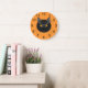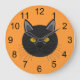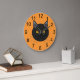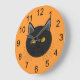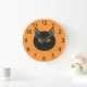 Um lindo rosto de gato preto com um fundo laranja brilhante adorna este relógio. Isso seria fantástico na parede de qualquer criança. Selecione entre várias formas e tamanhos.A cor de fundo é personalizável.