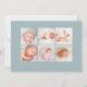 Os modernos anúncios de nascimento elegantes apresentam sua foto favorita de recém-nascido horizontal ou orientada à paisagem com "introdução" no topo em letras poeirentas de escrita verde caligráfica verde. O nome do bebê e as estatísticas de nascimento aparecem abaixo. Adicione mais seis fotos ao verso em um layout de colagem ou exclua para deixar o vazio.