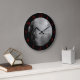 Um relógio de parede com números vermelhos vintage em preto e um fundo de um céu assustador de Halloween com árvores negras, corvos góticos e uma lua de cheio nublada.