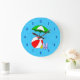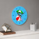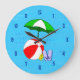 Arte divertida de brinquedos essenciais para a praia ou a piscina; uma bola vermelha de praia, um guarda-chuva verde, sandálias e óleo de bronzeado em fundo azul com ondas encaracoladas e números opcionais azuis. Clique em Personalizar para adicionar seu nome ou mensagem e até salvar seu design para mais tarde.