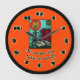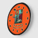 Um relógio de parede muito colorido com uma imagem de uma vela e alguns livros. O texto diz "Nunca é tarde demais para ler". O fundo é laranja brilhante. Este relógio seria excelente para um quarto para crianças, uma biblioteca, uma sala de leitura ou uma área de estudo. . Copyright Scarebaby Design.
