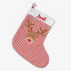 Opção de adicionar um nome a esta linda meia de Natal com fundo xadrez com a cabeça do Rudolph na frente.