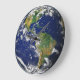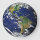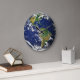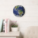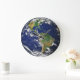 um relógio de parede com uma representação da terra, centrada na América do Norte e do Sul.