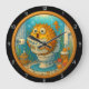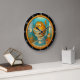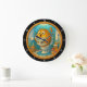 Esta imagem é um relógio circular na parede com uma jante preta e números brancos, com uma ilustração caprichosa de um marisco laranja com aspecto chocado vestindo óculos de ronco e lendo um jornal chamado "Dolphin Times" enquanto sentado em um banheiro. A cena é colocada debaixo d'água com paredes azuis, algas, estrelas e um cavalo marinho. As bolhas flutuam em torno do caractere peculiar, todas fechadas dentro de um quadro interno do ouro.
