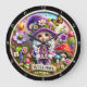 Este encantador relógio redondo apresenta um gnomo adorável com um grande chapéu roxo adornado com flores, cercado por flores vibrantes e cogumelos caprichosos. Uma borboleta voa por perto e uma faixa na parte inferior diz "BOAS-VINDAS". É uma peça encantadora perfeita para adicionar um toque de fantasia a qualquer quarto. Ideal para berçários, salas de estar ou como um presente único, trazendo um senso de magia e calor.
