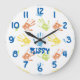 Personalize este relógio com um nome. As mãos pequenas são coloridas em amarelo, laranja, azul e verde. Os números estão em azul.