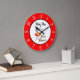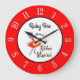 Um relógio personalizado com letras de escrita a ler o Mago da Cozinha em letras brilhantes a preto, vermelho e amarelo, e uma rapariga de cozinhar mágico. Os números retrógrados são brancos com um contorno preto ao redor da arte sobre um fundo vermelho. Personalize este relógio para alterar as cores de fundo, alterar elementos e muito mais.