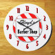 Um relógio de parede único lendo Barber Compra em letras de bloco com espaço para o seu nome em um script retroativo em um fundo listrado vermelho e branco cercado por letras vermelhas e pretas em branco.