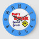 Este relógio da cozinha diz Pop Diner bom grub em letras vermelhas e azuis retroradas com um hambúrguer em amarelo. Os números são pretos em uma face externa azul. Um tema de arte de publicidade de restaurantes retrógrado para você ou seu cozinheiro de encomendas curtas favorito. Clique em Personalizar para alterar as cores de fundo e muito mais.
