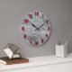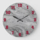 Um relógio com tintas de cinza e um fundo de mármore, e números vermelhos escuros.